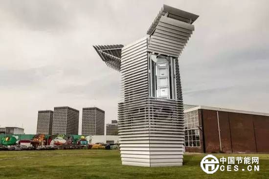 外观是白色百叶窗结构的空气净化塔,可以吸入被污染的空气,经过净化后再将干净的空气排出。