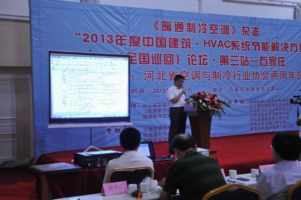 在会议的论坛阶段,由中国安装协会通风空调分会外联主任张建章和河北省空调与制冷行业协会秘书长马誉国交替主持。上海兰舍空气技术公司总监朱伟、河北科莱公司董事长董宝财、德图仪器国际贸易(上海)有限公司经理丛薇、北京中电宝晟公司总经理丁玉成、陕西奥升环境公司总经理徐东平、保定市硕达建筑安装公司总经理毕兴中就建筑室内环境节能技术、空气源超导辐射供暖系统、空调及制冷系统全面检测方案、电锅炉节能和中央空调水系统节能阀、中央空调综合节能、中央空调环境下的空气安全等问题做精彩演讲,与会者反响热烈。