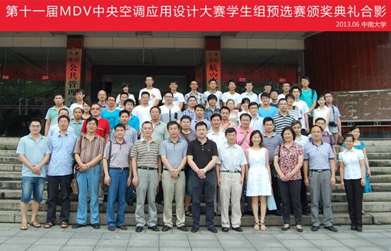 2013年6月15日,第十一届MDV中央空调设计应用大赛学生组预选赛颁奖典礼在中南大学民主楼礼堂落下帷幕。来自湖南省九所高校、部分设计院的专家学者、获奖学生、媒体等近100人参加颁奖典礼。湖南美的暖通设备销售有限公司总经理 朱磊,湖南省土木建筑学会暖通空调专业委员会主任委员、湖南省建筑设计院副总工程师袁建新,湖南省能源局副局长、中南大学能源科学与工程学院院长 廖胜明亲临颁奖典礼现场并致辞,对于MDV中央空调设计应用大赛以及学生组预选赛给予充分肯定和高度评价;祝贺在本次比赛中获奖的同学并期望他们能够为中华民族的复兴事业做出应有的贡献。原中南大学能源学院院长周孑民教授,中南大学能源学院段泽球书记、刘志强副院长,湖南大学土木工程学院建环系主任李念平教授,湖南科技大学能源与安全工程学院邹声华院长,湖南工业大学土木工程学院李灿院长,中机国际工程设计研究院副总工程师向宏,湖南省化工医药设计研究院副总工程师尹建新等领导专家出席颁奖典礼。