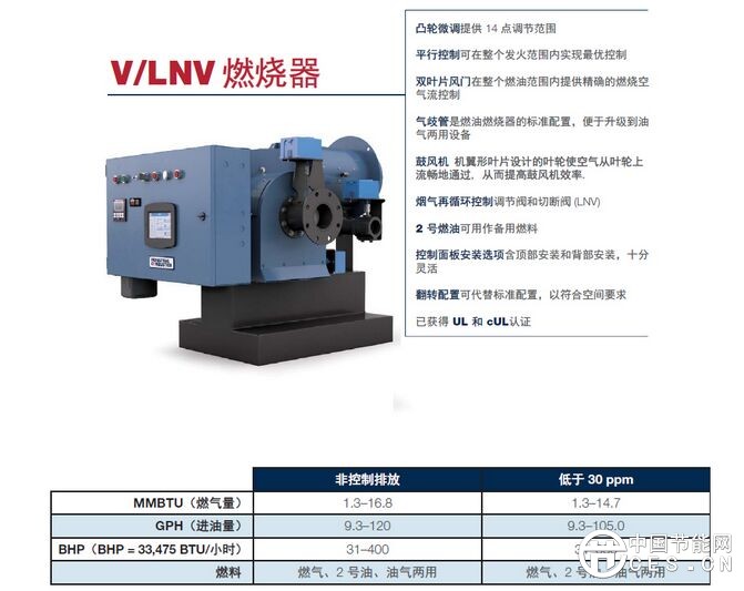 V系列燃烧器提供:天然气、丙烷气、空气雾化的2号油以及油气两用等燃料选项(从1.3至16.8MMBTU/小时)。LNV燃烧器,氮氧化物排放低于30ppm,提供天然气、丙烷气、空气雾化的2号油以及油气两用等燃料选项(从1.3至14.7MMBTU/小时)。