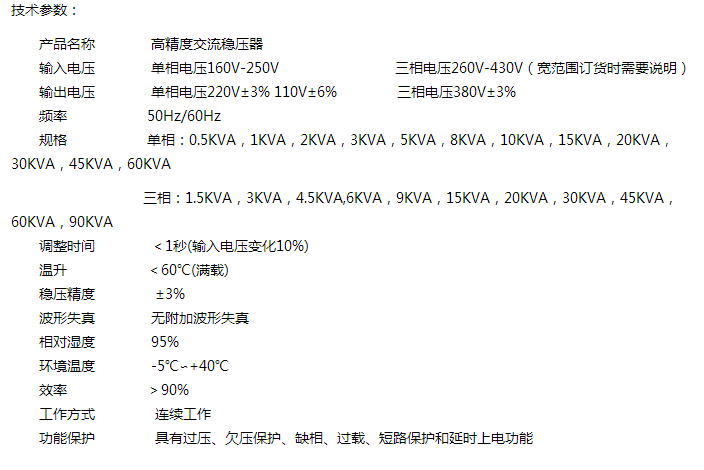 SVC(TND、TNS)系列单、三相高精度全自动交流稳压器,其结构由接触式自耦调节器、伺服式电动机、自动控制电路等组成,当电网电压不稳定或负载变化时,自动采样控制电路发出信号驱动伺服电机,调整自耦调节器碳刷的位置,使输出电压调整到额定值并达到稳定状态。三相高精度全自动交流稳压器是三个SVC系列单相产品性能的组合,其输入相制分三相四线制,输出电压为线电压380V在额定电容量范围内,可同时供电源电压为三相380V用电设备使用,并设有过压保护功能。