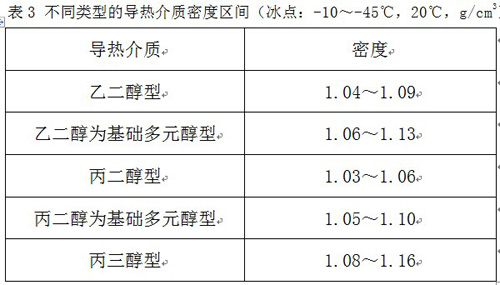 根据2009版《美国供暖制冷与空调工程师学会手册》提供的技术参数并结合我们的实践数据,我们总结出不同类型的导热介质在冰点-10~-45℃范围内密度区间,请参考表3。
