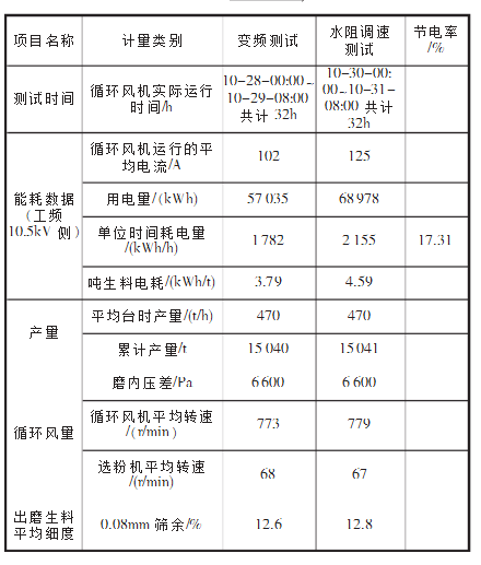 在相同的台时产量、相同的出磨细度下,分别测试生料磨循环风机液阻调速和变频调速状态下单位时间用电量;从一种调速方式转入另一种调速方式时,应进行停机停电,确保人身和设备的安全。