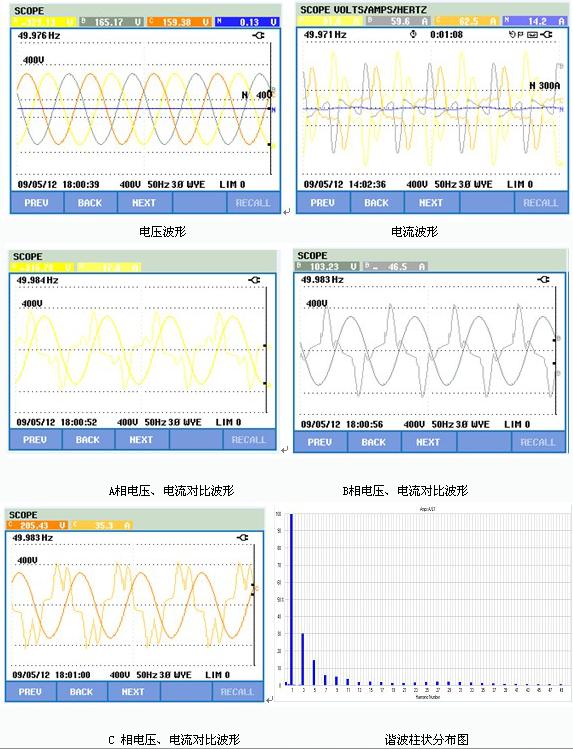 从上图的对比中可以看出:电压波形畸变很小,而电流波形畸变率非常严重,这是由于大量高次谐波叠加导致正弦波出现严重畸变。