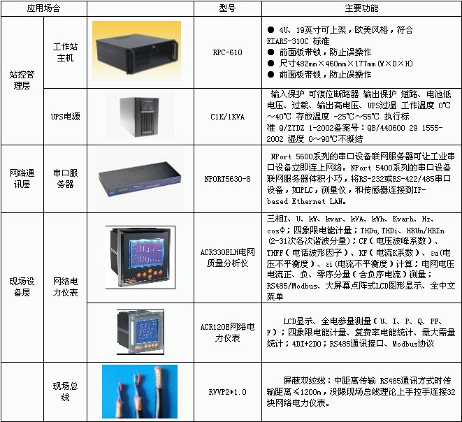 对天津河滨花园提出的需求和我们确定的组网方案,站控管理层设备层采购华北工控的工业主机,联想的显示器,SANTAK的UPS以及HP的打印机;网络通讯层使用MOXA的NPORT5630串口服务器;现场设备层采上海安科瑞公司ACR系列网络电力仪表,总线铺设屏蔽双绞线,以满足系统组网的要求,具体设备如下表: