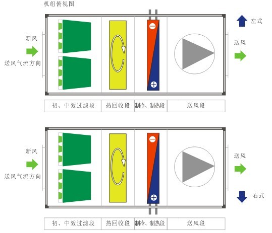 提供板翅和转轮两种热回收装置。板翅式热回收无需驱动装置,采用叉流式换热,换热充分,具有较高的换热效率;转轮式热回收采用直流换热,转轮芯体是一个以匀速转动的蜂窝状装置,显热芯体以金属铝箔为载体,全热芯体在铝箔上覆着3A分子筛,具有较强的吸热、吸湿效率。