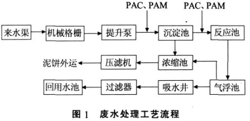 来自各生产单位的工业废水经管道或暗涵等最终汇入总废水明渠,进入污水处理系统。首先经机械格栅去除较大的杂物、漂浮物,经渣浆泵提升至中心配水井, 第一次投加PAC 和PAM;4 座辐流沉淀池的出水经方形明渠自流汇合进入机械反应池,在反应池前端再次投加PAC 和PAM, 经充分搅拌混合后进入12 格气浮池。气浮池出水经水泵加压送至纤维球过滤器处理后,进入厂区回用水池循环使用。废水处理工艺流程如图1 所示。