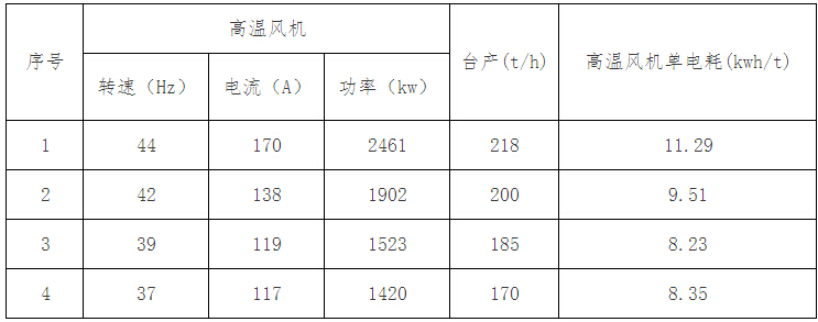 从表中数据看出,产量控制在280-300t/h范围,风机单耗3.04-3.11kwh/t,而最经济的运行参数应选择循环风机在37Hz,台产300t/h。课题组决定暂按此参数运行,在运行过程中,再通过操作员的摸索,探索出更优化的参数。我们认为,只要操作员逐步适应后,单耗还有降低的空间。