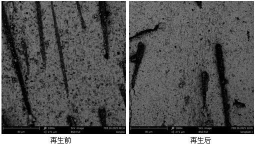 通过SEM电镜分析再生前后催化剂表面堵塞的清除情况,相比未做任何处理的催化剂,再生后的催化剂表面洁净效果明显,说明了再生后确实对废旧催化剂堵塞去除有一定的效果,然而表面洁净程度并不能完全反应催化剂的再生效果,仍需进一步进行催化剂的活性测试。