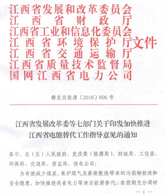 从江西省发改委获悉,江西省发展改革委等七部门关于印发加快推进江西省电能替代工作指导意见的通知已经下发。意见中明确指出,加强工业领域大气污染综合治理,逐步淘汰分散燃煤锅炉。到2017年,除必要保留的以外,各设区市城区范围内基本淘汰10蒸吨/小时及以下的燃煤锅炉,禁止新建20蒸吨/小时以下的燃煤锅炉;其他地区原则上不再新建10蒸吨/小时及以下的燃煤锅炉。具体内容如下: